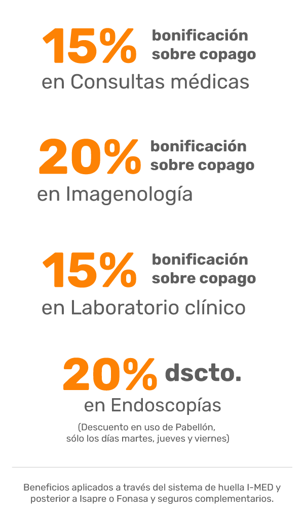 • Las bonificaciones médicas serán aplicadas sobre el copago, esto quiere decir, posterior a Fonasa, isapres y/o seguros complementarios.